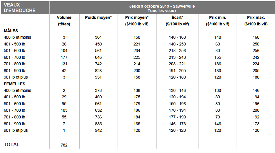 Voici les prix obtenus lors de l’encan de Sawyerville lors de la vente de veaux charolais. Prendre note que les charolais ce sont vendu au début et par la suite les autres races. Les données sont pour toutes les races de veaux. (Source : FBQ)